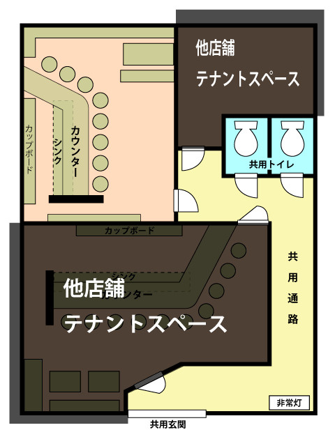 ※居抜き店舗のため付随する設備等は中古品となるため故障に関する修理や買い替えは入居者様の負担となります。駐車場なし※共用トイレ水道料金・電気代は1Fテナント間で協議の上、按分精算となります。また、共用部分の清掃は1F店舗間で分担制になります。