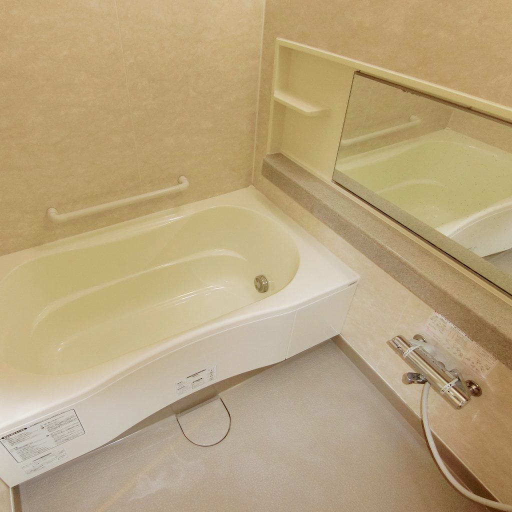 洗面脱衣所にはデザイン性が高く使い勝手の良い嬉しい三面鏡化粧台♪浴室は追い焚き機能付きでいつでも温かなお湯に浸かれますね。